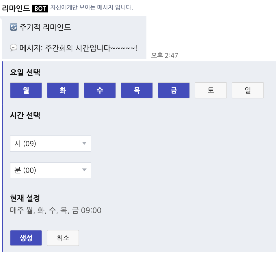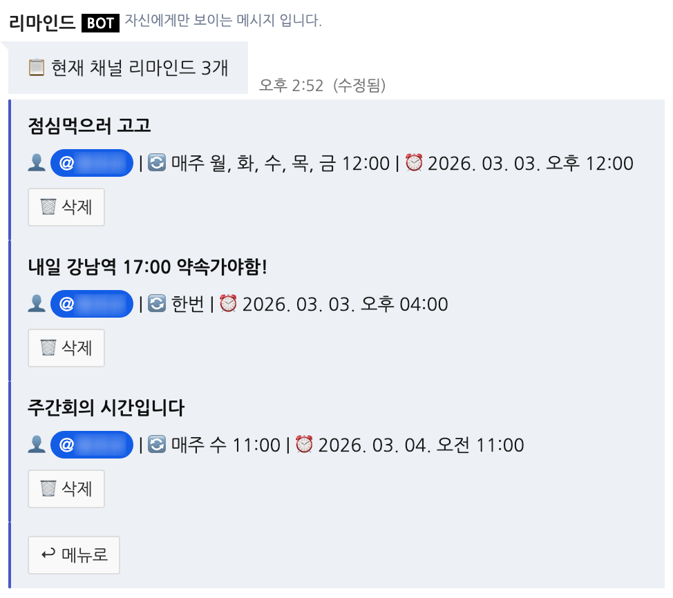 두레이 메신저에서 단건 예약 메시지와 반복 메시지를 슬래시 커맨드로 등록/관리할 수 있는 써드파티 서비스입니다. NHN Dooray의 공식 서비스가 아니며, NHN Dooray와 제휴 또는 직접적인 관련이 없습니다.